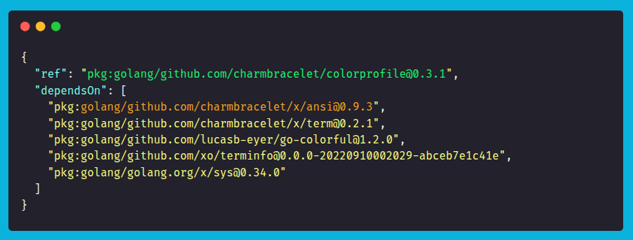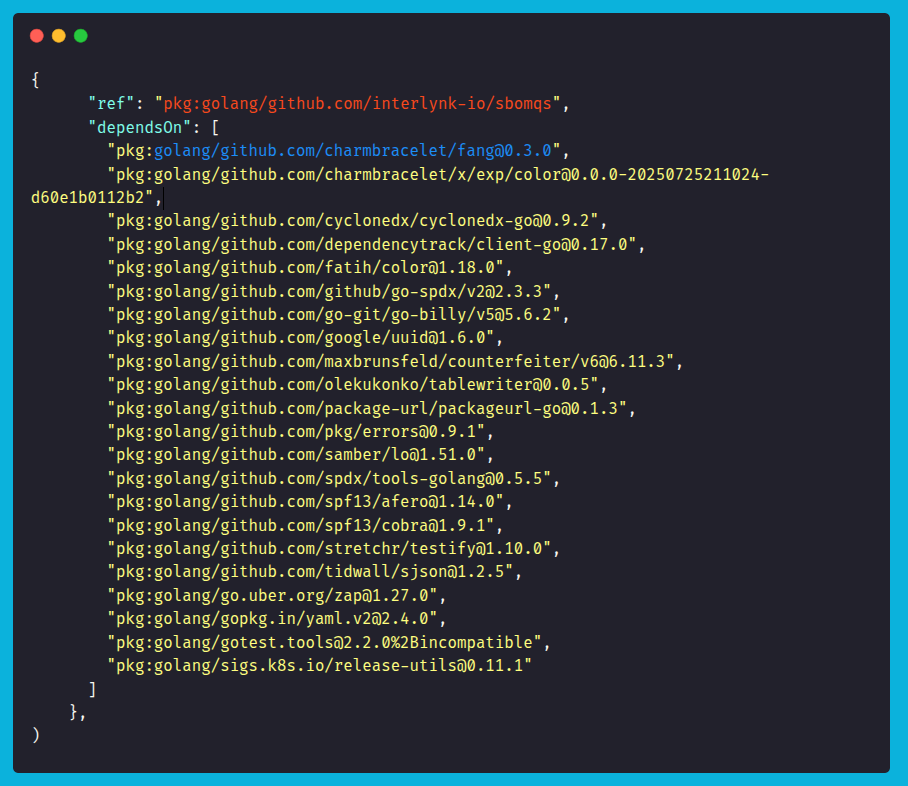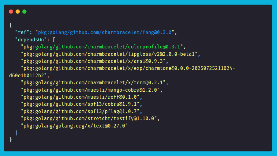 Let’s take the sbomqs project, which directly depends on fang. Let’s see these dependencies from SBOM of sbomqs project: